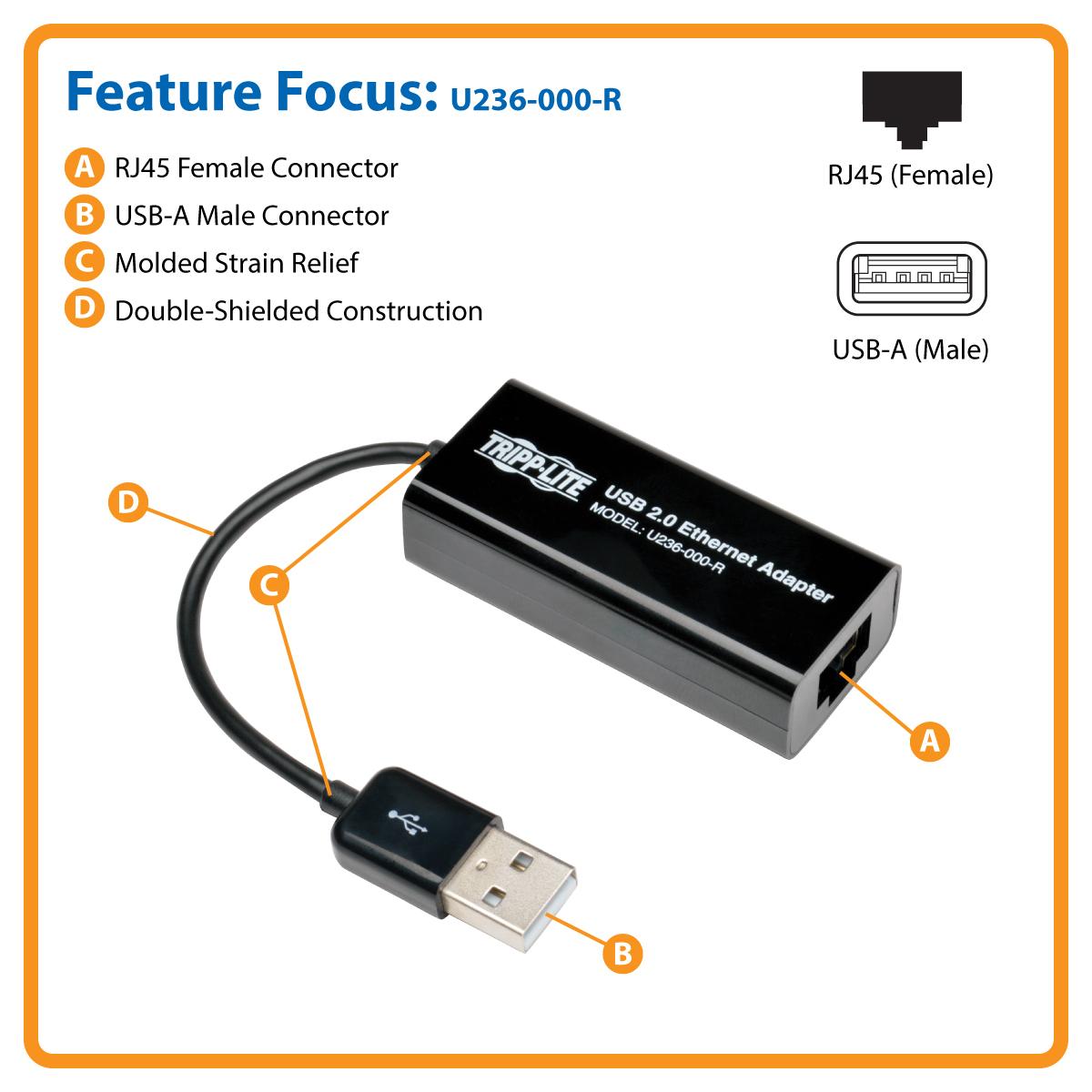 El adaptador de Ethernet USB 2.0 U236-000-R de Tripp Lite permite a su computadora conectarse instantáneamente a una red 10/100Mbps a través de un puerto USB – sin necesidad de abrir el gabinete de su computadora para agregar una tarjeta Ethernet interna. La compatibilidad del adaptador con USB 2.0 (480Mbps) asegura una velocidad de red 10/100 Mbps al 100% sin menoscabo alguno. Además, el adaptador es compacto y es energizado por el bus USB; no requiere adaptador externo de energía.